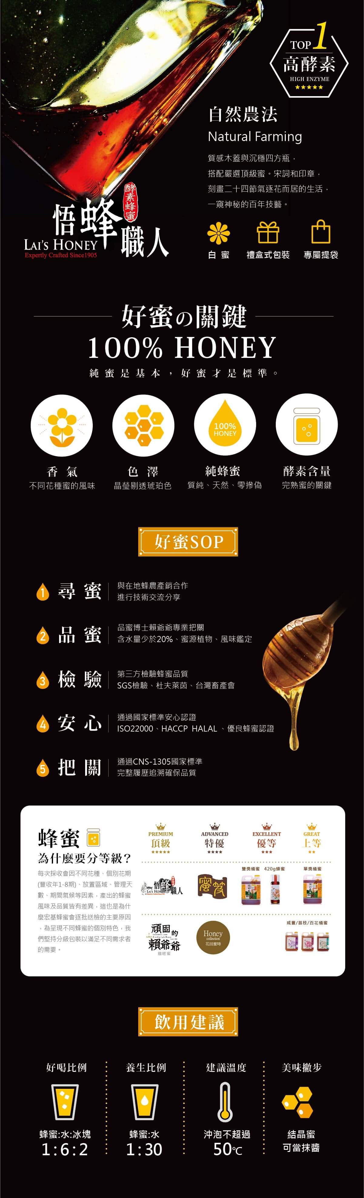 ●品名:悟蜂職人 白蜜 280g《易結晶》●容量:280g/瓶●成分:蜂蜜●原產地:台灣●保存期限:二年 ●保存方法:常溫不宜冷藏、曝曬,請放置陰涼處存放,避免碰到水。 ●使用方法:可以冷、溫開水泡開,再加冰塊、果片。可和牛奶、咖啡調和或當抹醬、沾醬或調理。 ●注意事項:1.八個月以下幼兒不宜飲用。2.不與生石膏類食品、生甲殼魚類、生蠔類同食(間隔二小時)。3.蜂蜜為農產品,每批品質會隨氣候與環境而有所異。4.結晶乃晶種自然轉化,可寬心使用。