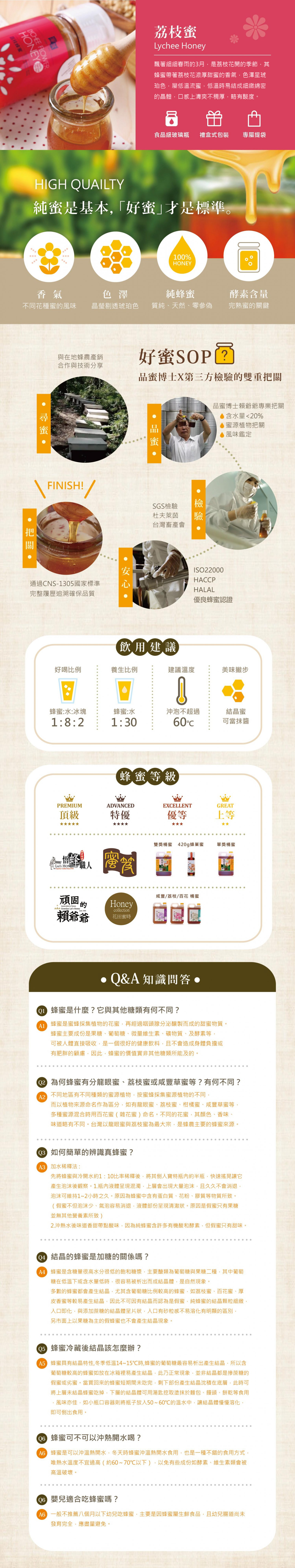 ●品名:蜜笈 荔枝蜂蜜《易結晶》●容量:700g/瓶●成分:蜂蜜●原產地:台灣●保存期限:二年●保存方法:常溫不宜冷藏、曝曬,請放置陰涼處存放,避免碰到水。●使用方法:可以冷、溫開水泡開,再加冰塊、果片。可和牛奶、咖啡調和或當抹醬、沾醬或調理。 ●注意事項:1.八個月以下幼兒不宜飲用。2.不與生石膏類食品、生甲殼魚類、生蠔類同食(間隔二小時)。3.蜂蜜為農產品,每批品質會隨氣候與環境而有所異。4.結晶乃晶種自然轉化,可寬心使用。