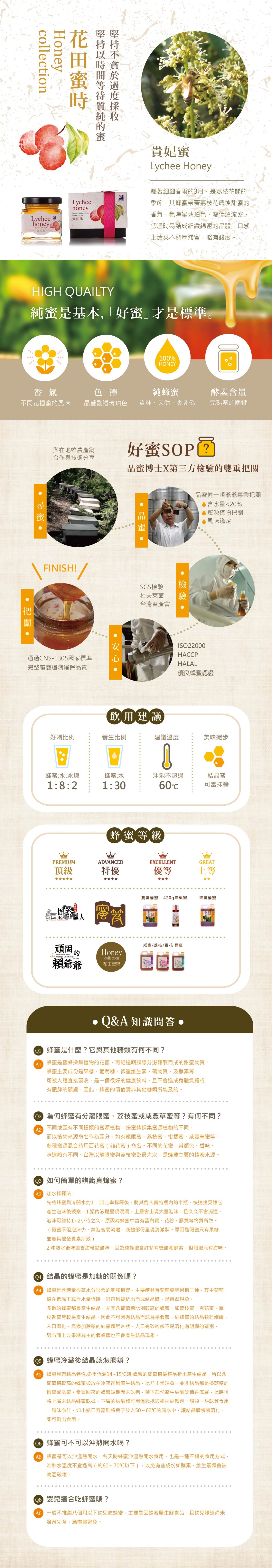 ●品名:花田蜜時 - 貴妃蜜 130g 《易結晶》●容量:130g/瓶●成分:蜂蜜●原產地:台灣●保存期限:二年●保存方法:常溫不宜冷藏、曝曬,請放置陰涼處存放,避免碰到水。●使用方法:可以冷、溫開水泡開,再加冰塊、果片。可和牛奶、咖啡調和或當抹醬、沾醬或調理。 ●注意事項:1.八個月以下幼兒不宜飲用。2.不與生石膏類食品、生甲殼魚類、生蠔類同食(間隔二小時)。3.蜂蜜為農產品,每批品質會隨氣候與環境而有所異。4.結晶乃晶種自然轉化,可寬心使用。