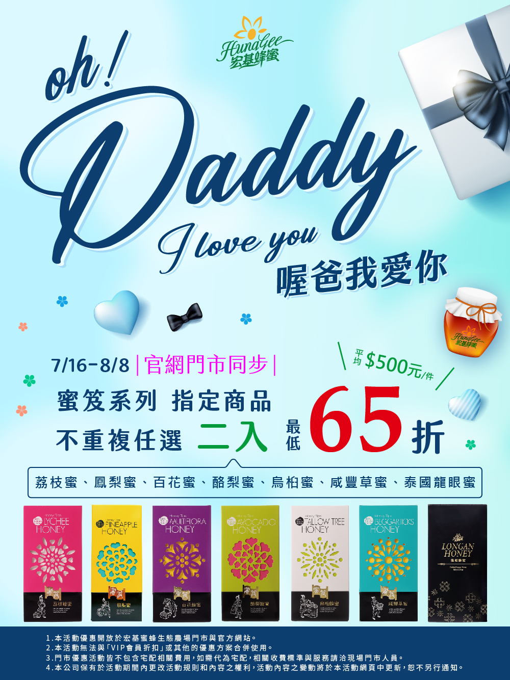 唯一不變的是爸爸總忙著為全家大小,拚一個更好的生活,沒時間好好的照顧自己,這時可要準備最上等的優質蜂蜜,來撫慰爸爸勞碌的身心靈。宏基蜂蜜這次父親節,準備超優質組合折扣,讓你的超級心意給爸爸滿滿的續航力。
