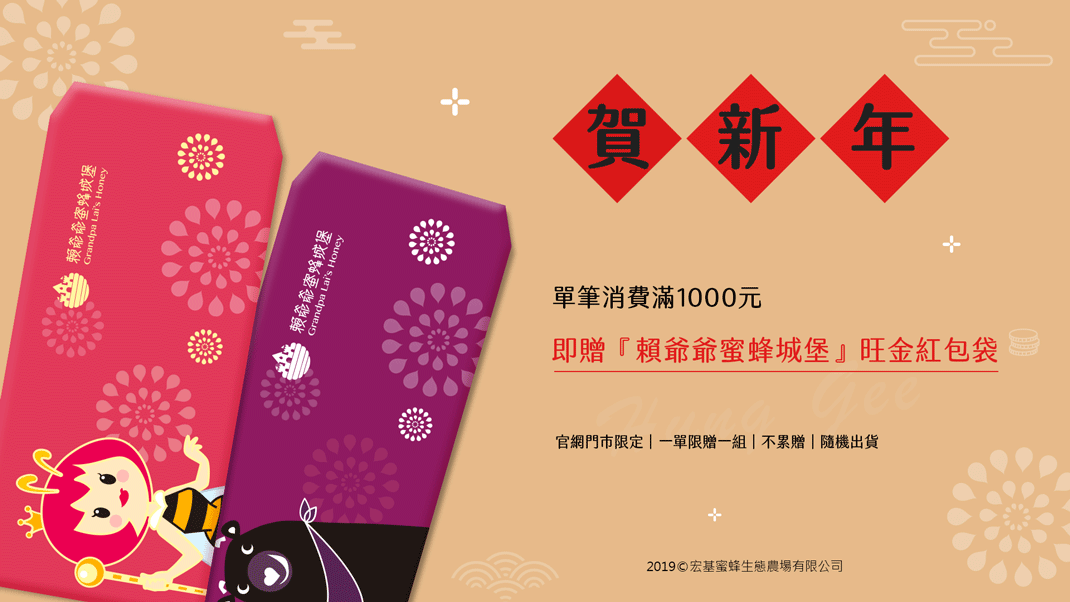 即日起至宏基蜂蜜官網、宏基蜜蜂生態農場實體門市,購蜜消費單筆滿1000元,即贈『賴爺爺蜜蜂城堡』系列旺金紅包袋,數量有限送完為止~! 讓您平安開心過好年喔! ※一單限送一組,不累贈、各款式隨機出貨。