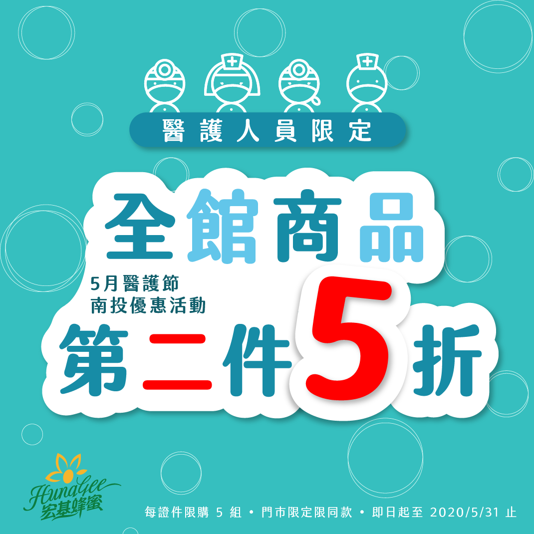 從即日起至2020年5月31日,醫護人員只要持相關證件,於本農場門市,即享同款商品第二件半價優惠!!(每證件限購五組)