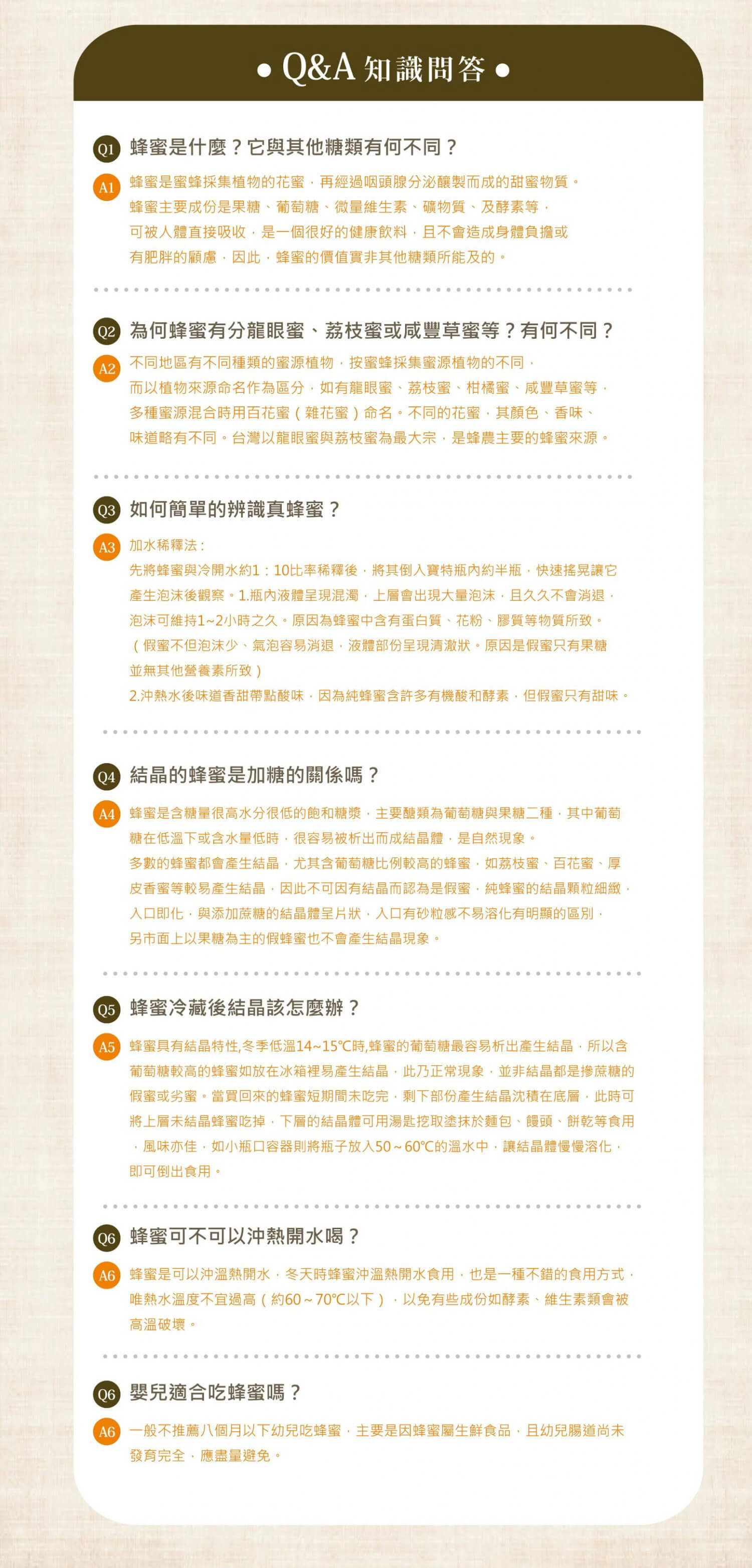 ● Product Name:Meiji Longan Honey [TAP] 700g● Capacity: 700g/bottle● Ingredients: 100% Pure Honey (Taiwan)● Origin: Taiwan● Shelf Life: Two years● Expiration Date:Must be shipped at least 240 days before the expiration date.● Nutrition Facts: See the graphic for details.● Storage:Do not refrigerate or expose to direct sunlight. Store in a cool, dark place away from water.● Usage:Can be dissolved in cold or warm water and then added with ice cubes or fruit slices.Can be mixed with milk or coffee or used as a spread, dip, or seasoning.● Precautions:1. Not suitable for children under eight months old.2. Do not consume with foods containing gypsum, raw crustaceans, or raw oysters (two hours apart).3. Honey is a commercial product; the quality of each batch may vary depending on climate and environment.4. Crystallization is a natural transformation of the seed crystal; use with confidence.