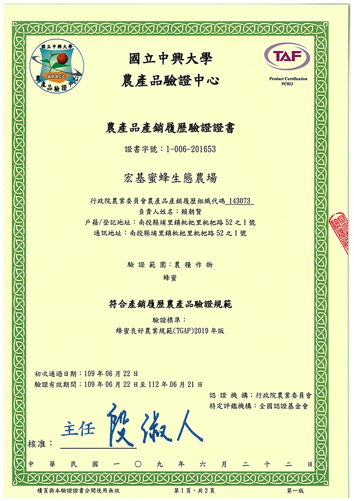• Certified by the TAP Honey (TAP:Taiwan / Traceability Agricultural Product 產銷履歷農產品)